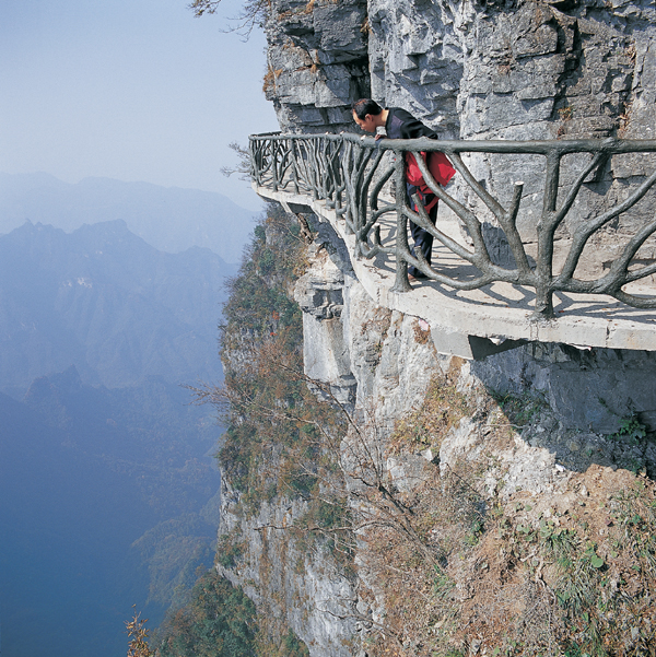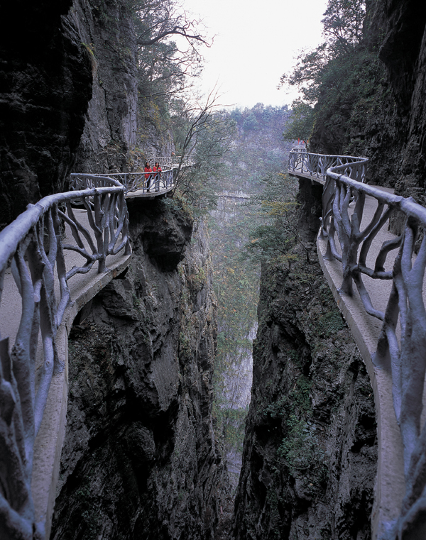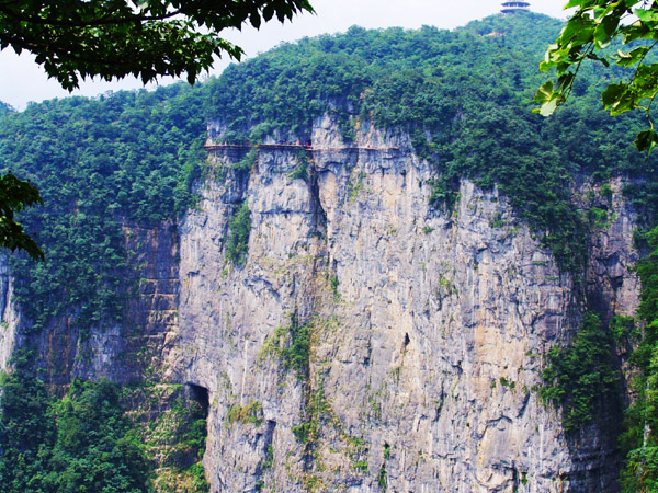站在棧道上俯瞰群山,古人“會(huì)當(dāng)凌絕頂,一覽眾山小”的感覺(jué)油然而生.由于天門(mén)山是國(guó)家森林公園,植被特別豐富,加上典型的喀斯特地貌,所以,在這條棧道上更能找到一種在乘坐直升飛機(jī)飛越熱帶雨林大峽谷的感覺(jué),這平時(shí)只能在電影里看到的場(chǎng)景,在這里能讓你身臨其境.