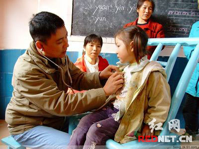 (愛心醫(yī)生網(wǎng)友“逮點(diǎn)叭水”在為孩子們免費(fèi)檢查身體)