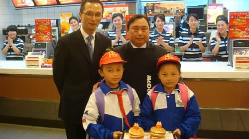 張家界市人大副主任王海生(后排右一)在麥當(dāng)勞湖南、武漢、浙江市場(chǎng)營(yíng)運(yùn)總監(jiān)李輝的陪同下,親自制作了張家界解放路麥當(dāng)勞餐廳的第一個(gè)巨無(wú)霸漢堡,并贈(zèng)送給當(dāng)?shù)丶彝ヘ毨У暮⒆觽儭?/P>