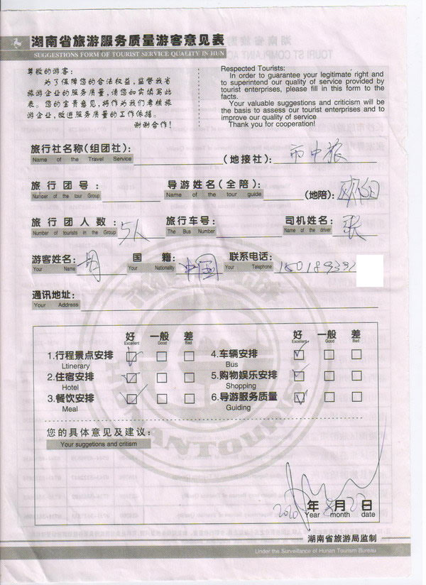 香港胡先生一行5人旅游質(zhì)量回饋