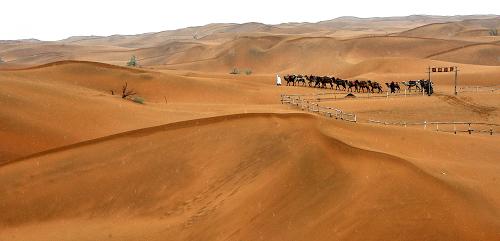 一隊駱駝隊穿行在寧夏中衛(wèi)沙坡頭旅游風景區(qū)(5月16日攝)。寧夏回族自治區(qū)三面環(huán)沙,且沙漠緊鄰河流、湖泊、草原,旅游資源豐富,交通條件便利。2009年,寧夏沙漠旅游收入超過2億元。新華社記者 劉泉龍 攝