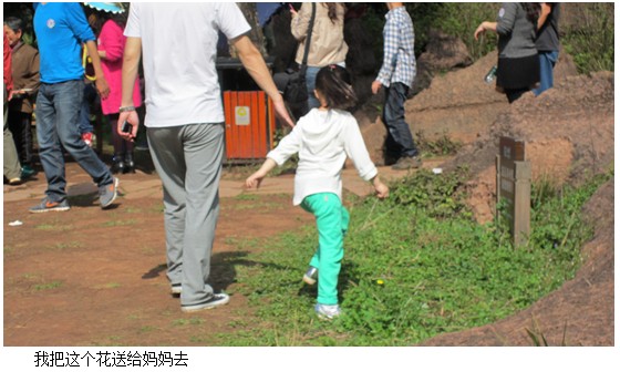 當看到路旁的各種野花時,這位小女孩又突發(fā)奇想:“爸爸,等等我,我給媽媽送朵花!薄安灰S便摘花哦!痹捯粑绰,女兒卻早已將野花摘在手上。等趕到媽媽將花送給媽媽時,媽媽的臉上洋溢著的是滿滿的欣慰與幸福,“來我給你插上!眿寢寣⑿∫盎ú逶诹诵∨⒌念^上。