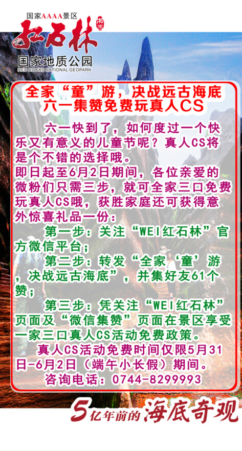 第三步:憑關(guān)注“WEI紅石林”頁面及“微信集贊”頁面在景區(qū)享受一家三口真人CS活動免費(fèi)政策。