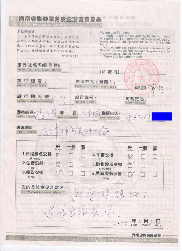 天津李先生一行7人旅游質(zhì)量回饋