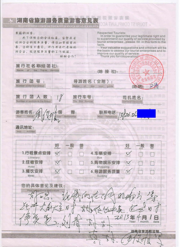 廣東周先生一行18人旅游質(zhì)量回饋單