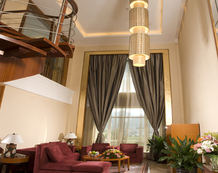 樓中樓套房:面積118平米?蛷d寬敞高挑,超大衛(wèi)生間,時(shí)尚的設(shè)計(jì)讓房間的通風(fēng)、采光及日照達(dá)到極限,窗外可看到百丈峽風(fēng)景。