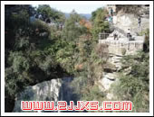 下車后小走幾步,便是上山游道,再沿著左邊的臺(tái)階下行50米,便可見(jiàn)一橢圓的石門,請(qǐng)大家屏住呼吸,不要出聲:請(qǐng)看在門前的左上角,有一石突出,像一只兇猛的動(dòng)物,但此時(shí)卻特別安靜,你看它四肢伏地,抿嘴翹鼻,閉目養(yǎng)神,感覺(jué)中似乎伴有輕輕的“鼾”聲。大家沒(méi)有想到吧,它可就是鎮(zhèn)守后花園的雄獅?大家千萬(wàn)別吵醒它。透過(guò)石門往里看,這里真是別有洞天啊,您看那生意盎然的“盆景”,那似是而非的“假山”;那櫛次枇鄰的“屏風(fēng)”、“壁畫(huà)”、“雕刻”;那形狀逼真的石桌、石椅;還有那川流不斷的“小橋流水”……這是誰(shuí)的“大宅院”呢?不是,這是大自然的鬼斧神工造就了如此精美秀麗的“后花園”。進(jìn)“后花園”往右走,在一石崖下有一條棧道,要貓著腰、低著頭,方能過(guò)去,站在中間向?qū)γ娲蠼幸宦暎骸拔覑?ài)你——”,將會(huì)有經(jīng)久不息的回聲從中傳出,愛(ài)——你——,愛(ài)——你——,愛(ài)——你……這種釋放會(huì)使您有一種從未有過(guò)的輕松和快感。