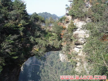 “后花園”至天下第一橋,有一條全長(zhǎng)2000多米的游道,路面多為白色的條石鋪成,站在遠(yuǎn)處觀望,很像一條白色的綢帶打了兩個(gè)結(jié),一頭系在“迷魂臺(tái)”,一頭第在“天下第一橋”。信步漫游,沿途可欣賞到“拜仙臺(tái)”、“百丈絕壁”、“小洞天”、“情人谷”等別有情趣的景點(diǎn),這里海拔不高,一般不受氣候影響,慢慢品味,定會(huì)使您賞心悅目。 “天下第一橋”是張家界“十大絕景”之一。也是袁家界的標(biāo)志性景點(diǎn),它是居于兩山之間形成的一座天然石橋,而兩山原為一體,橋身是兩山相連的關(guān)鍵部分,但因中間石質(zhì)較為薄弱,由于風(fēng)化、崩塌作用的影響,又經(jīng)過(guò)日曬雨淋、流水洗刷、山洪沖擊,久而久之,終于形成今天這一特別的奇景……。