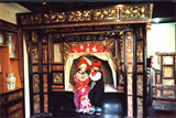 【廂房講解】現(xiàn)在您走進(jìn)的是右?guī),在這里,您所看到的是一張清朝光緒年間的雕花大床,我們土家人稱之為”滴水床“。為何要叫滴水床呢,究其原由,有兩個方面的原因,一方面是因?yàn)檫@張床在風(fēng)格上仿照了士家民居中層檐的層進(jìn)結(jié)構(gòu),層層疊疊,酷似屋檐,一般的床有三層,最多的可達(dá)七層,故稱”滴水“;另一方面則是因?yàn)橥良易逄厥獾娘L(fēng)俗習(xí)慣__哭嫁而得名,哭嫁是土家人典型的婚俗習(xí)慣,過去,土家姑娘十一.二歲開紿學(xué)習(xí)哭嫁,會不會哭嫁成了人們權(quán)衡姑娘聰明或者笨的標(biāo)準(zhǔn)之一,而且要求得哭出眼淚來,眼淚水越多就越吉利,因而取眼淚滴答滴答流淌之意,故稱此床為”滴水床“,據(jù)說一張滴水床制作費(fèi)工費(fèi)時,有時要幾年時間才能得以完工,因此滴水床又稱做為”千工床“。兩邊廂房還擺設(shè)的家具如箱柜,衣廚.衣架.洗臉架.梳妝臺.屏風(fēng).桌椅,無一不飾雕花。