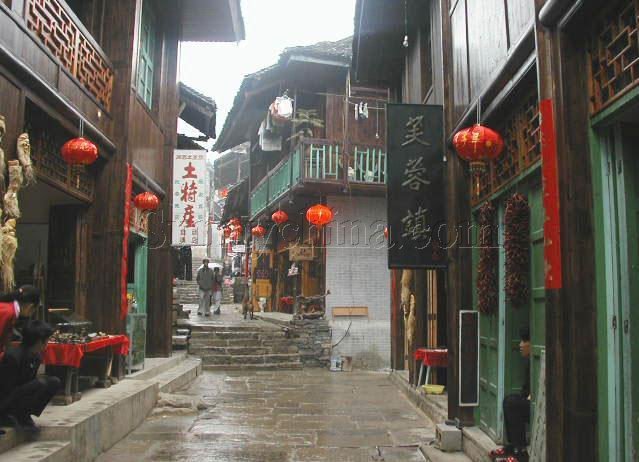 溪洲銅柱現(xiàn)存于芙蓉鎮(zhèn)民俗風(fēng)光館內(nèi)。公元940年,楚王馬希范與溪州刺使彭士愁多年交戰(zhàn)媾和,締結(jié)盟約,劃疆而冶,鑄5000斤銅柱為證。據(jù)史截:“后晉天福四年(公元939),溪州刺史彭士愁與當(dāng)時占據(jù)湖南的楚王馬希范發(fā)生溪州之戰(zhàn)。彭士愁戰(zhàn)敗后于后晉天福五年(公元940年)與馬希范議和,把戰(zhàn)爭的經(jīng)過和議和的條款,鐫刻于銅柱之上。銅柱重五千斤,高丈二尺,入土六心,形為八面,中空,內(nèi)實鉅錢,柱端覆蓋銅頂,銘誓狀于銅柱之上,立于會溪,宋天禧二年(公元1018年)重立時,又羼刻了一些土官銜名。清中葉,柱上銅頂被盜,沉于江心,柱內(nèi)銅錢亦被人以飴粘錢殆盡。清光緒十一年(公元1885年),永順府知府張曾揚建亭保護。民國年間亭被毀!便~柱的銅質(zhì),精純光潤;八面所鐫顏、柳體陰文,雖經(jīng)千載風(fēng)雨洗刷,霜雪蝕磨,仍清晰如初。溪州銅柱是研究土家族古代歷史的重要文獻。土家族視銅柱為神物。   古鎮(zhèn)石板街遠遠望去,總感覺芙蓉鎮(zhèn)五里青石板街就像一本線裝古籍的書脊,書頁被上蒼之手打開,靜謐而又穩(wěn)重地攤在酉水河邊,那書頁上凌空的吊腳樓和發(fā)生在樓里樓外的悲歡離合便隨歲月而動,演繹出許多鏗鏘溫馨、跌宕起伏的故事來……   湘西芙蓉鎮(zhèn)這個看上去普普通通的村落,原來是秦漢時土王的王都,古稱酉陽,五代十國時稱溪州。后因電影《芙蓉鎮(zhèn)》在此拍攝,于是人們便把此地叫做芙蓉鎮(zhèn)。   史書記載“位酉水北面,是酉水的重要碼頭,通川黔、達鄂瀘,舟楫之便,得天獨厚”。   從碼頭開始綿亙而上的石階,那是一條長達五里貫穿古鎮(zhèn)的青石板路,它沒有名字,于是人們就直接管它叫五里長街。踏上古街,似乎踩在被悠長歲月遺落的碎片上面。不知不覺走到掛有“土家觀瀑吊腳樓”牌匾的民俗博物館前,從手搖腳踏的棉花機、閹豬鳴號的羊角到世代相傳的雕花牙床,近百件散發(fā)著鄉(xiāng)土氣息的民間用具,展示著土家族古老豐富的歷史?醋o人說,這是一位土家族年輕人爬山涉水收集來的,靜靜地訴說著這個小村古老的過去。這棟三層的小樓,一半落在河岸上,另一半?yún)s是由水泥柱支撐著,水泥柱直插河底,任水流日日夜夜地沖刷,小小的吊腳樓仍穩(wěn)穩(wěn)當(dāng)當(dāng)站在那里,任憑時間的流逝。好聰明的土家人,巧借一片水面,竟建起了如此妖嬈的住房。   拾級而上,山路一般的陡峭。兩旁的青瓦木房鱗次櫛比,順山勢而錯落有致。幾家織錦商店已經(jīng)開門,說是商店,不如叫作坊更確切些,因為店里的主要面積,都為織錦機所占領(lǐng),色彩斑斕的挎包、壁掛、床上用品等都掛在墻上,游客不僅可以駐足欣賞姑娘們的手和梭子在織錦機上飛動的瀟灑,還可以慢慢觀賞陳列品的藝術(shù)特色。據(jù)說,當(dāng)?shù)氐墓媚镌瓉碇唤o親人和情郎穿針引線,如今卻生產(chǎn)出異彩紛呈的土家織錦來賣給陌生人,從情感所系的“非賣品”到只有技巧表現(xiàn)的商品,這種生活方式和情感上的跨越,仿佛不過是一夜之間的事。   有趣的是,米豆腐沿街都是,每一家都掛出電影《芙蓉鎮(zhèn)》的劇照,以示自己的正宗。其實在電影拍攝之前,米豆腐就早已是這里的特色,為什么要依賴那一個虛構(gòu)的故事呢?20年前,一部電影把“深居閨閣人未識”的這個小小村鎮(zhèn),從地圖上尋找出來,放在世人面前,然后將影響這里的多少代人,甚至深入到他們的骨髓。從那以后,曾經(jīng)與世隔絕的寧靜被打破了,而這種深刻的影響,大概就是從一碗米豆腐開始。   傍晚還剛剛來臨,長街上的小吃店就紛紛亮起昏暗燈光。這些家庭式小店,全都是當(dāng)?shù)厝藦淖约杭曳殖鲆粔K地方來順帶做的。鮮甜的桂花魚,以及肥美的“天下第一螺”,和米豆腐一樣,成為那里最難忘的美味。在村子里一座貞節(jié)牌坊旁,又發(fā)現(xiàn)清心透涼的另一種美味———冰鎮(zhèn)土家自釀糯米酒。聰明能干的土家人,他們自給自足,自在悠閑地生活著,男人在外打漁,女人在家織布,世世代代,沉浸在自己的文化里面。
